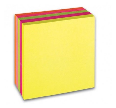 Neonový samolepicí bloček - kostka, 5 barev- žlutá, růžová, zelená, červená, fialová, celkem 400 lístků, ideální pro zanechání vzkazů, instrukcí a připomínek, nezanechávají stopy, mohou být použity a aplikovány opakovaně.